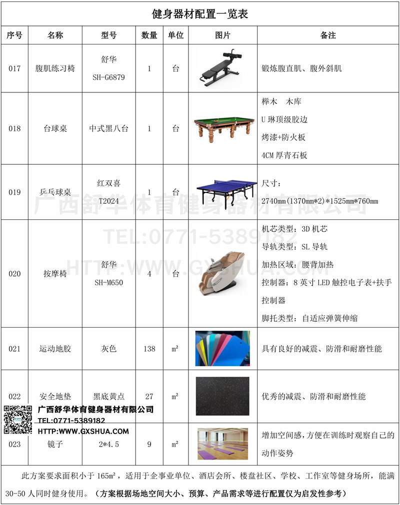 18.台球桌*1张-单位健身房配置台球桌,为员工的业余生活增添了乐趣和选择。与传统的健身器材锻炼相比,台球具有更强的娱乐性和趣味性,能够吸引更多员工参与到健身活动中来,提高健身房的使用率,让员工在工作之余有更多放松身心的方式。
