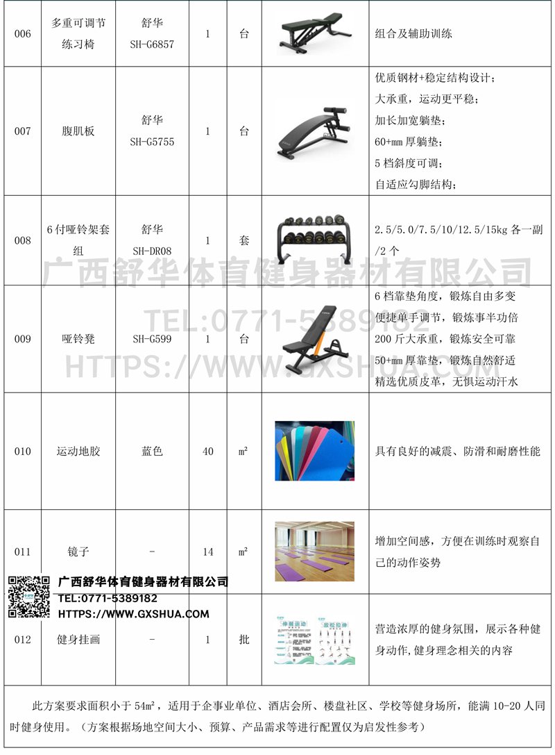 此方案要求面积小于54m²,适用于企事业单位、酒店会所、楼盘社区、学校等健身场所,能满10-20人同时健身使用。(方案根据场地空间大小、预算、产品需求等进行配置仅为启发性参考)
