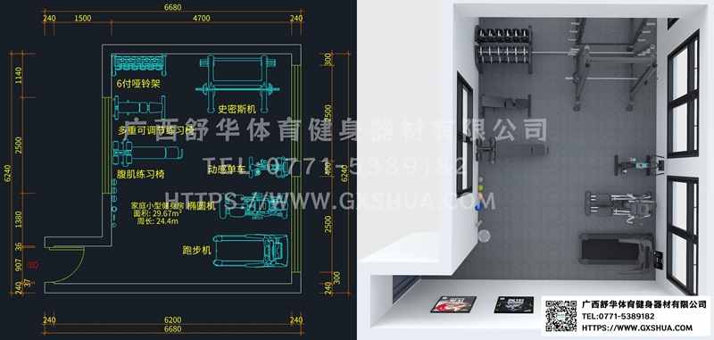 此方案要求面积小于30m²,适用于小型单位健身房、工作室、家庭健身房等健身场所,能满5-8人同时健身使用。(方案根据场地空间大小、预算、产品需求等进行配置仅为启发性参考)
