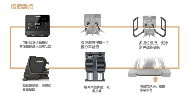 安全稳重,细节制胜。银河GalaxyV8椭圆机是一款高安全系数的椭圆机,整体设计遵循人体工学科学,缓震踏板中添加减震层设计,能够有效减少运动冲击带来的关节损伤,且最大支持160kg载重,满足更多人群。手握心率监测、多功能置物架、自发电系统取代统电源......在细节上,新款椭圆机站在健身者角度,添加了不少设计者的巧思,为健身者带来更贴心的体验。