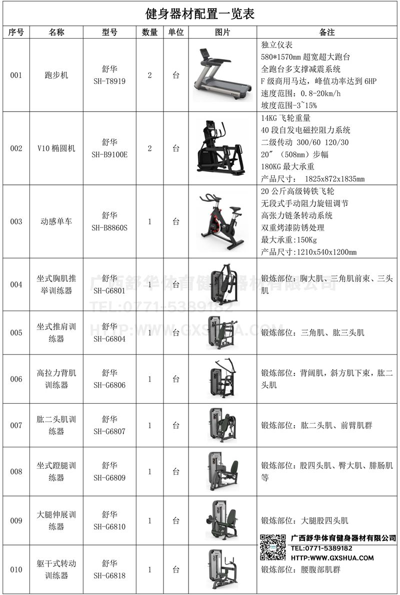 1.银河GalaxyV9高端跑步机SH-T8919*2台-独立仪表-简洁大气,全新外观设计,健康运动新选择;心率监测功能,可通过手握心率、无线心率带等不同方式实时采集心率数据;580*1570mm超宽超大跑台-跑感舒适,跑台整体安全稳定;全跑台多支撑减震平台,保证跑台超强支撑力,达到180kg支撑,满足专业健身房需求。F级商用马达-超强马达,AC 3.0HP 交流,峰值功率达到6HP,F级商用品质。速度范围达到0.8-20km/h;V9跑步机可实现跑台扬升功能,坡度范围-3~15%,满足客户不同的锻炼需求。