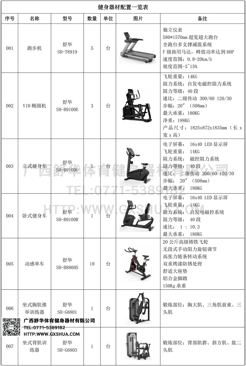 1.银河GalaxyV9跑步机SH-T8919*5台-独立仪表-简洁大气,全新外观设计,健康运动新选择;心率监测功能,可通过手握心率、无线心率带等不同方式实时采集心率数据;580*1570mm超宽超大跑台-跑感舒适,跑台整体安全稳定;全跑台多支撑减震平台,保证跑台超强支撑力,达到180kg支撑,满足专业健身房需求。