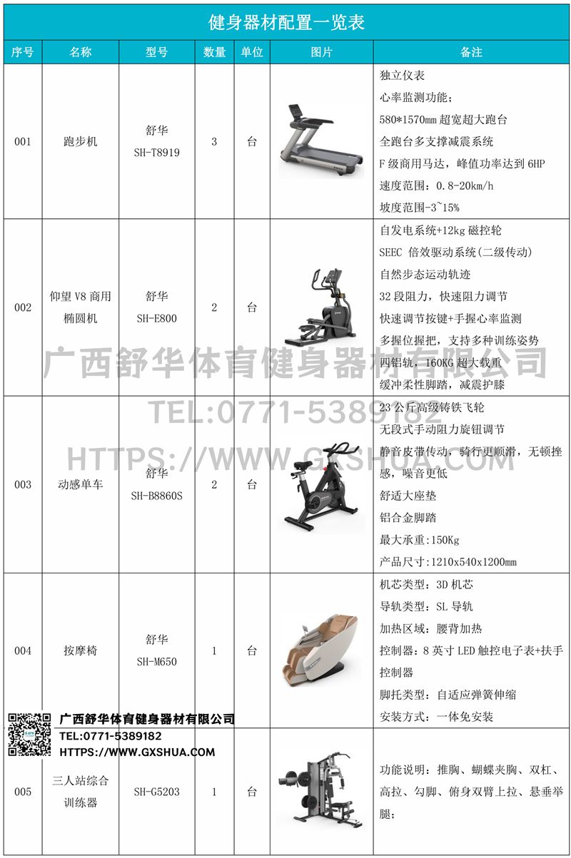1.银河GalaxyV9跑步机SH-T8919*3台-F级商用马达-超强马达,AC 3.0HP 交流,峰值功率达到6HP,F级商用品质。速度范围达到0.8-20km/h;V9跑步机可实现跑台扬升功能,坡度范围-3~15%,满足客户不同的锻炼需求。