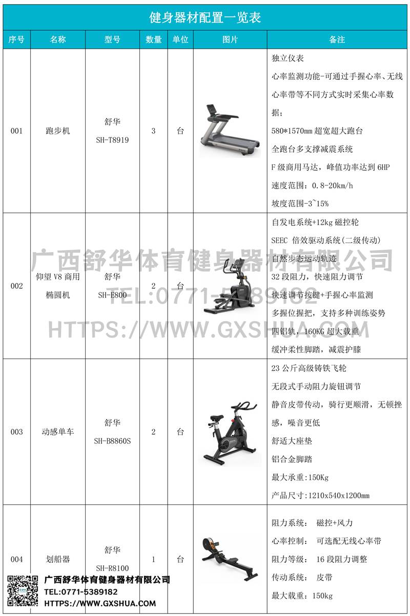 1.银河GalaxyV9跑步机SH-T8919*3台-580*1570mm超宽超大跑台-跑感舒适,跑台整体安全稳定;全跑台多支撑减震平台,保证跑台超强支撑力,达到180kg支撑,满足专业健身房需求。F级商用马达-超强马达,AC 3.0HP 交流,峰值功率达到6HP,F级商用品质。速度范围达到0.8-20km/h;V9跑步机可实现跑台扬升功能,坡度范围-3~15%,满足客户不同的锻炼需求。