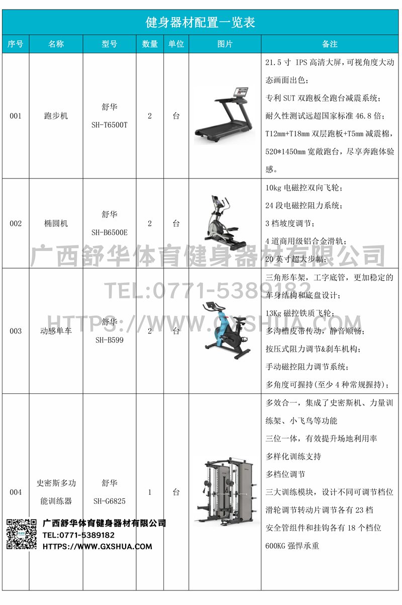 1.银河GalaxyX5 Pro跑步机SH-T6500T*2台-采用高性能电机,提供稳定动力,支持长时间高强度运行,适合长时间有氧训练,跑台宽敞,提供舒适跑步空间,减少运动中的束缚感,适合不同体型用户。配备先进减震系统,有效缓解跑步对关节的冲击,降低运动损伤风险,内置智能控制系统,支持多种预设程序和个性化训练计划,用户可根据需求调整速度和坡度,满足多样化训练。