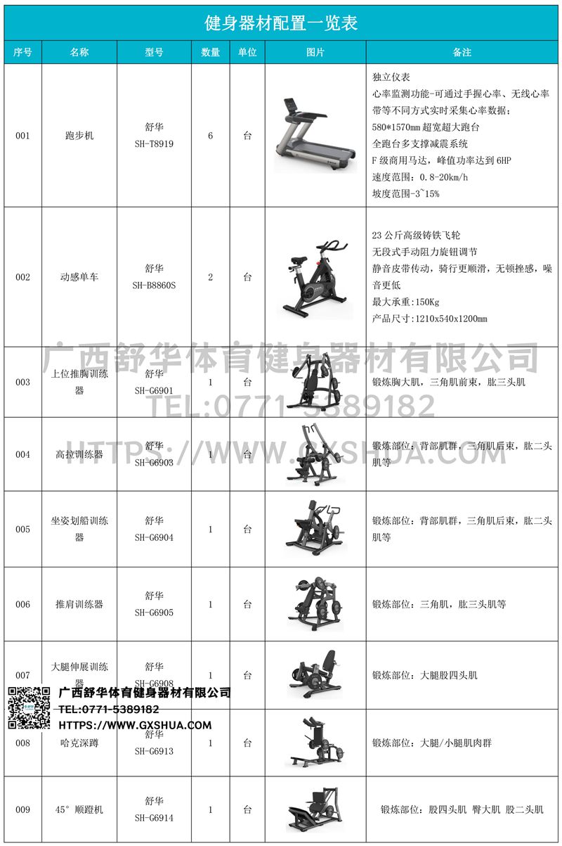 1.银河GalaxyV9跑步机SH-T8919*6台-580*1570mm超宽超大跑台-跑感舒适,跑台整体安全稳定;全跑台多支撑减震平台,保证跑台超强支撑力,达到180kg支撑,满足专业健身房需求。F级商用马达-超强马达,AC 3.0HP 交流,峰值功率达到6HP,F级商用品质。速度范围达到0.8-20km/h;V9跑步机可实现跑台扬升功能,坡度范围-3~15%,满足客户不同的锻炼需求。