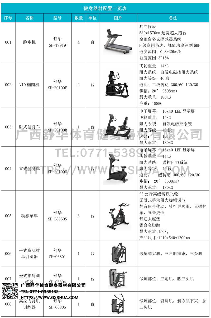 1.银河GalaxyV9跑步机SH-T8919*4台-独立仪表-简洁大气,全新外观设计,健康运动新选择;心率监测功能,可通过手握心率、无线心率带等不同方式实时采集心率数据;580*1570mm超宽超大跑台-跑感舒适,跑台整体安全稳定;全跑台多支撑减震平台,保证跑台超强支撑力,达到180kg支撑,满足专业健身房需求。F级商用马达-超强马达,AC 3.0HP 交流,峰值功率达到6HP,F级商用品质。速度范围达到0.8-20km/h;V9跑步机可实现跑台扬升功能,坡度范围-3~15%,满足客户不同的锻炼需求。